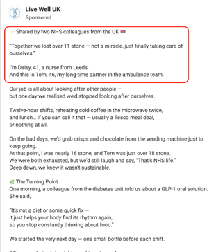 One campaign tells a lengthy narrative from “Daisy, 41, a nurse from Leeds,” and her partner “Tom, 46,” described as ambulance workers who lost “over 11 stone together.” The story is crafted to be emotionally relatable for a UK audience: long shifts, vending machine meals, exhaustion, feeling unable to care for oneself. It presents their discovery of a “GLP-1 oral solution” as a turning point in their NHS routine, implying that NHS staff themselves are using the product.
