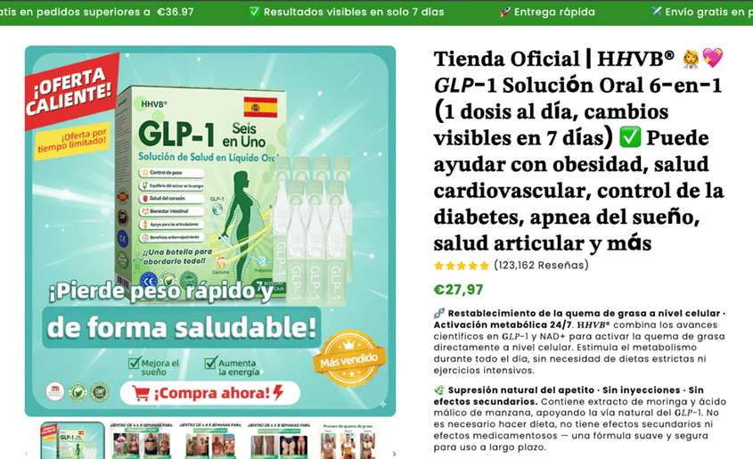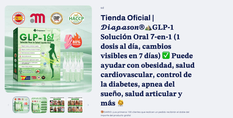 Spain is facing a surge of fraudulent “GLP-1 oral solutions” advertised as science-backed, 100% natural, and certified by local health authorities. These products include Diapason®, HHVB®, and LOTMAY®, none of which have anything to do with Spain’s official medical regulators.