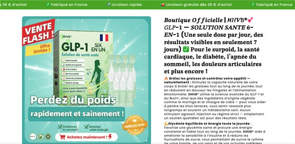 One popular French-language campaign advertises HHVB® GLP-1 SIX EN UN, plastered with French flags and “Fabriqué en France” banners to convey authenticity.