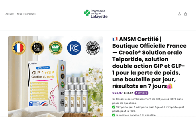 This ad impersonates Pharmacie Lafayette and falsely claims the product is “ANSM certifié”, directly misusing France’s national drug safety authority name. The Croaie® GLP-1 + GIP packaging displays fake pharmaceutical seals (ISO, GMP, USP, FCC) and “Made in France” badges to appear clinically validated. The design imitates a real French pharmacy site, clean white layout, price drops, and refund guarantees, but the product and certifications are entirely fabricated.