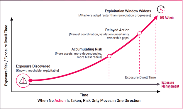 What the diagram makes clear is that risk doesn’t stay flat while organizations deliberate. From the moment an exposure is discovered and is reachable, exploitable, and known – the clock starts ticking. As time passes, environments change, dependencies grow, and attackers adapt faster. Remediation workflows fall behind. Manual coordination, unclear ownership, and fear of disruption all extend what is increasingly referred to as ‘exposure dwell time’. It’s defined as the period during which a known exposure remains open and exploitable. The longer that window stays open, the more likely it is that a theoretical risk turns into a real incident.