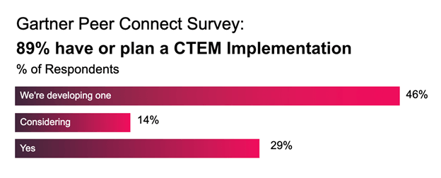 If exposure management feels like a pressing concern, that’s because it is. According to a Gartner Peer Connect Survey, 89% of organizations either have or plan to implement a Continuous Threat Exposure Management (CTEM) program. Nearly half are already actively developing one, while others are evaluating how to operationalize it across teams. This reflects the growing opinion that the way organizations have managed exposure in the past no longer scales.